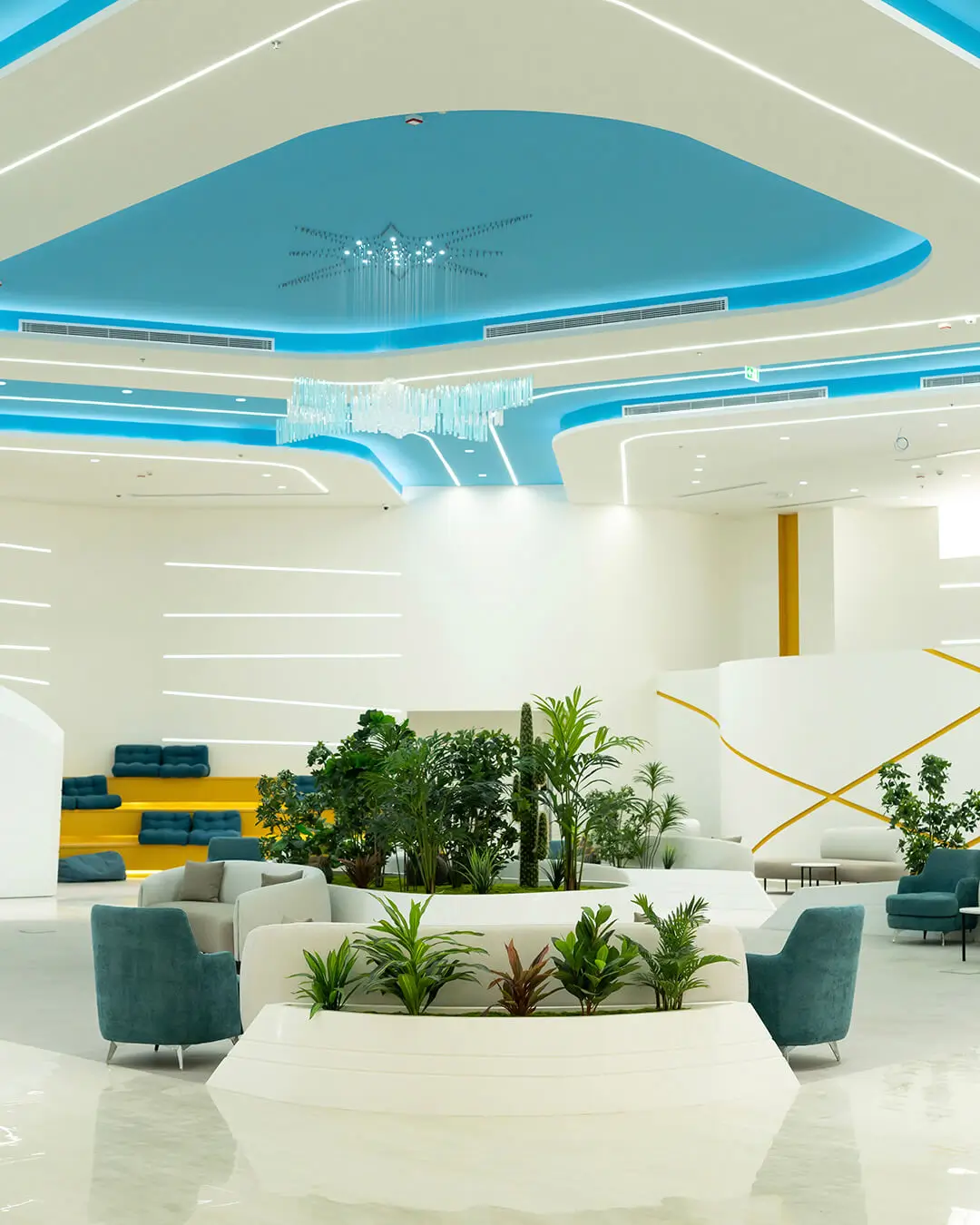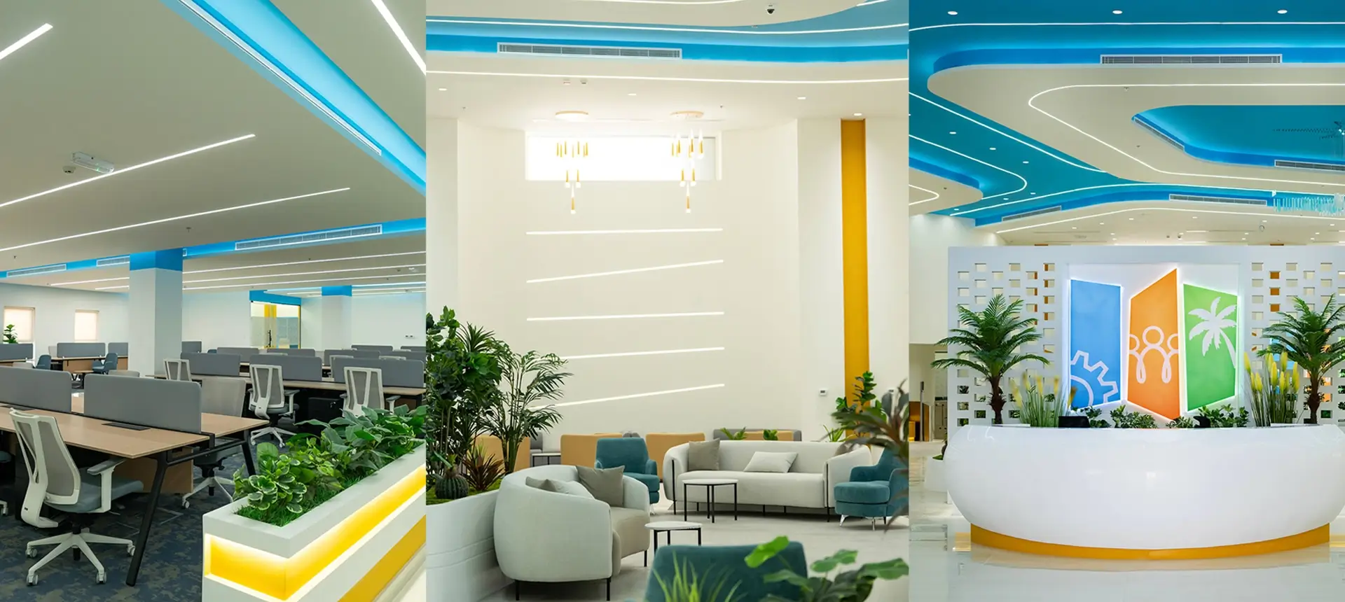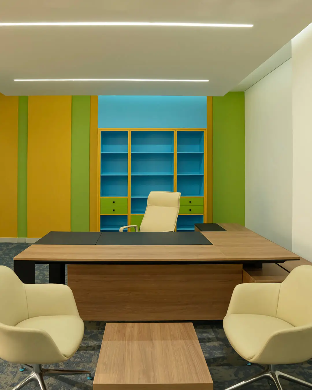 This project showcases a dynamic and welcoming workspace designed to inspire creativity, collaboration, and productivity. The design balances bold colors with clean lines and natural elements, creating an energetic yet calming atmosphere that supports both formal meetings and informal interactions.